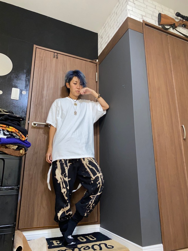 色を抜いて白いペイントを少し施しました。 手作業のため同じ柄はございません。 モデル:162㎝ パーカー:L スエットパンツ:S